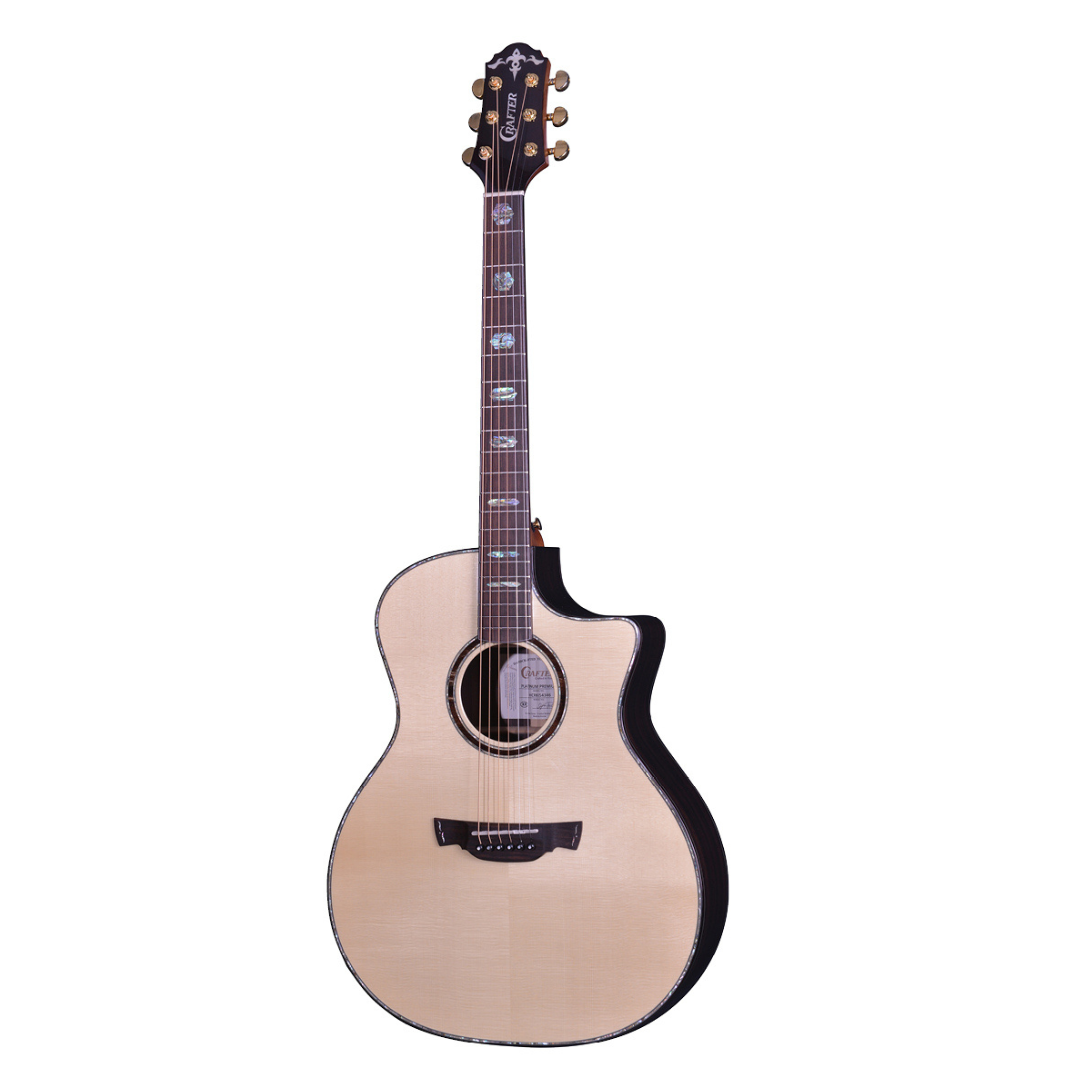 The Crafter SRP G-36ce is a premium 6-string acoustic guitar from the Stage Premium series, designed for musicians who demand exceptional tone, striking aesthetics, and performance-ready features. Its Grand Auditorium Cutaway body offers a versatile sound profile, delivering crisp highs and deep, resonant lows, perfect for both stage and studio settings. The guitar features a Solid Engelmann Spruce top paired with a Solid Indian Rosewood back and layered sides, ensuring a rich, dynamic tone with excellent projection. The African Mahogany neck and Indian Rosewood fingerboard provide a smooth, responsive playing experience, while the gloss finish accentuates the guitar’s elegant craftsmanship.