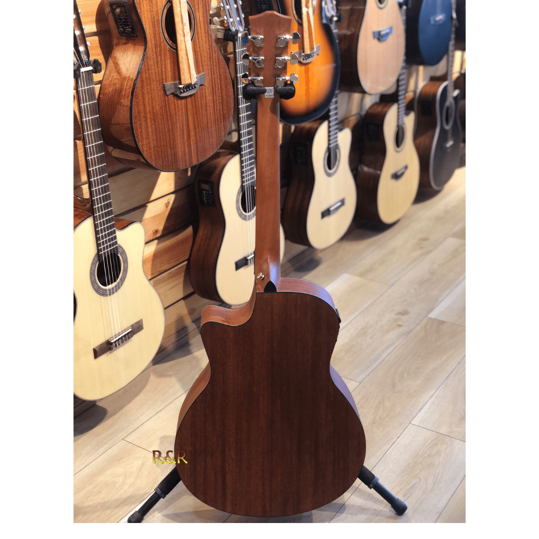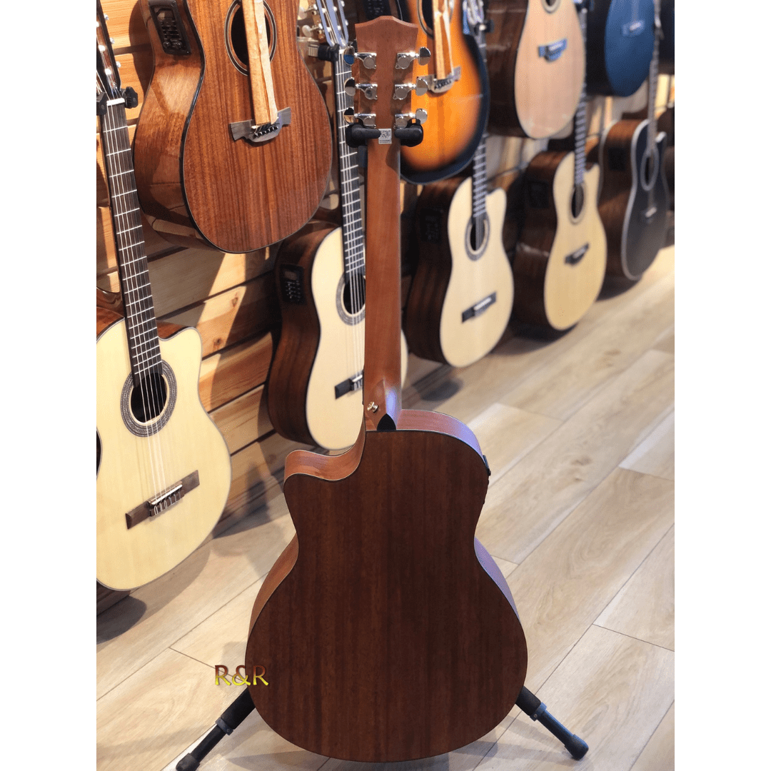The guitar’s top is made from AA laminated Sitka spruce, known for its excellent tonal qualities and durability. The back and sides are crafted with a dual-layer construction featuring high-grade Sapele wood on the inside and Agathis wood on the outside, ensuring resonance and sturdiness. The Nato neck is shaped in a comfortable C-profile, while the rosewood fretboard and bridge add a touch of elegance and superior sound quality.